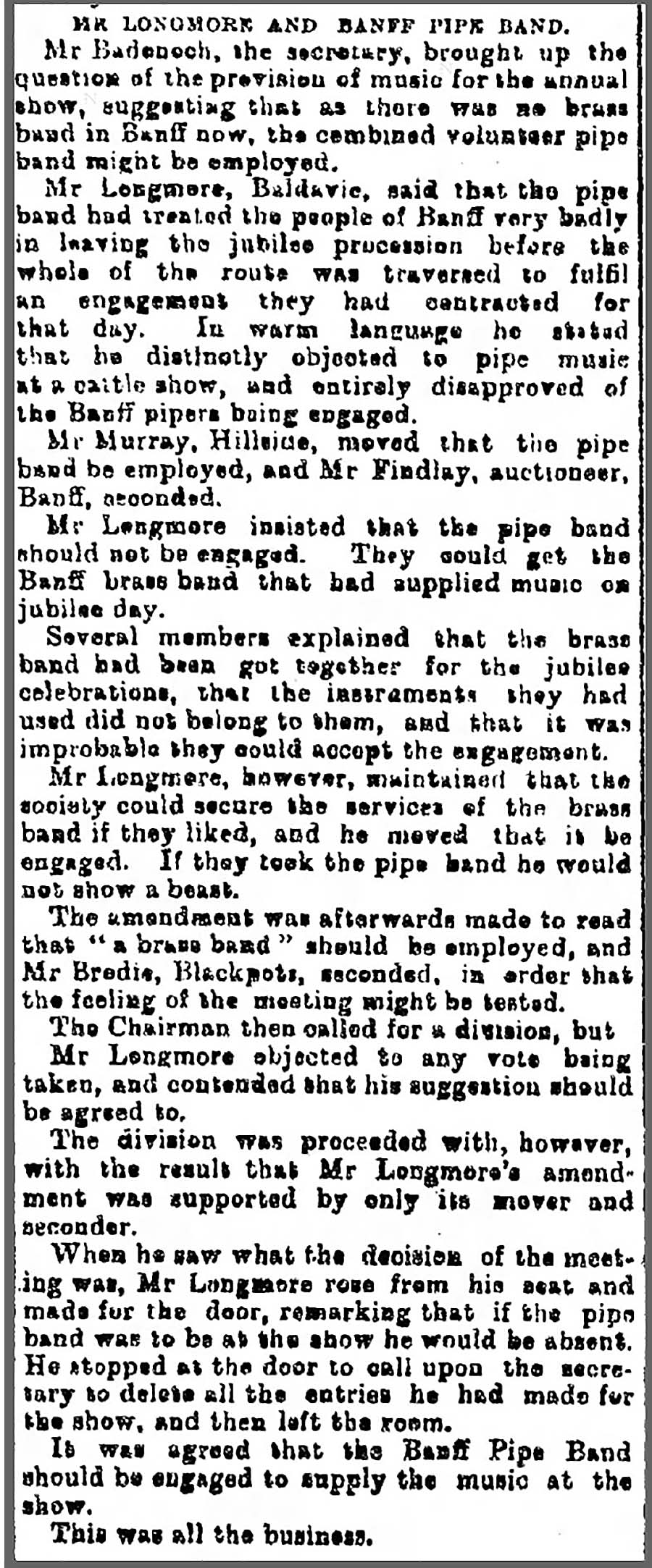 Mr Longmore: “If you really wanted the brass band you could make it happen (my imagined words). He was firm that “if they took the Banff Pipe Band he would not show a beast”. One Mr Bredie seconded a motion to employ the brass band – just to “test the room”. The motion failed to pass with Mr Bredie the sole person in favour of the jingtinglers and trumtookas.