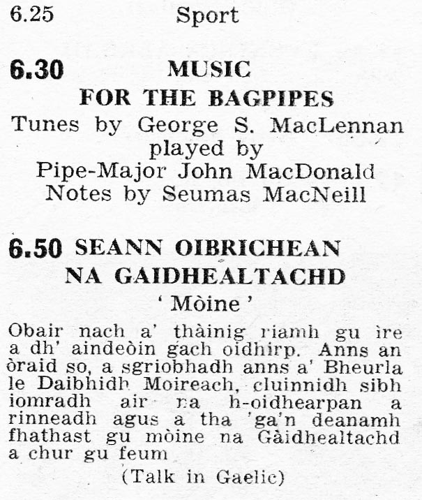 You’ll know John MacDonald was a VIP in the history of piping. In 1949, when he was 84 years old, Seumas MacNeill (another VIP, but I think for different reasons) invited John MacDonald to record a radio broadcast. The plan was to have MacDonald record tunes from the pen of the late, great player and composer, George S McLennan. GS was a contemporary of MacDonald’s and Seumas could likely smell the scent of a big news story in getting John MacDonald to agree to his proposal. And agree he did.
