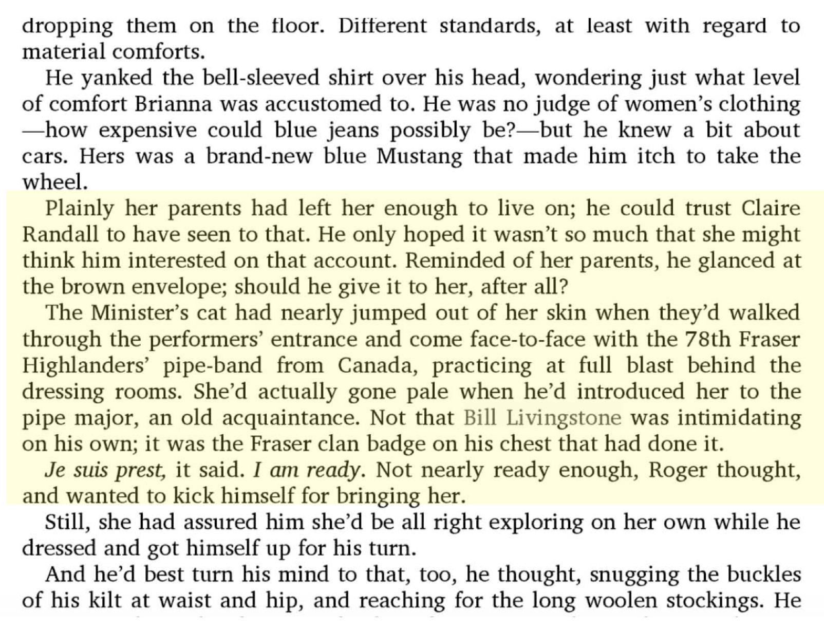 Here we see, in Gabaldon’s 1997 Outlander volume, one of the piping world’s most well-kent faces turn up, along with the 78th Fraser Highlanders Pipe Band – the band he led at the time (apparently “…practicing away at full blast …”, is there any other way?), the appearance of Bill Livingstone:
